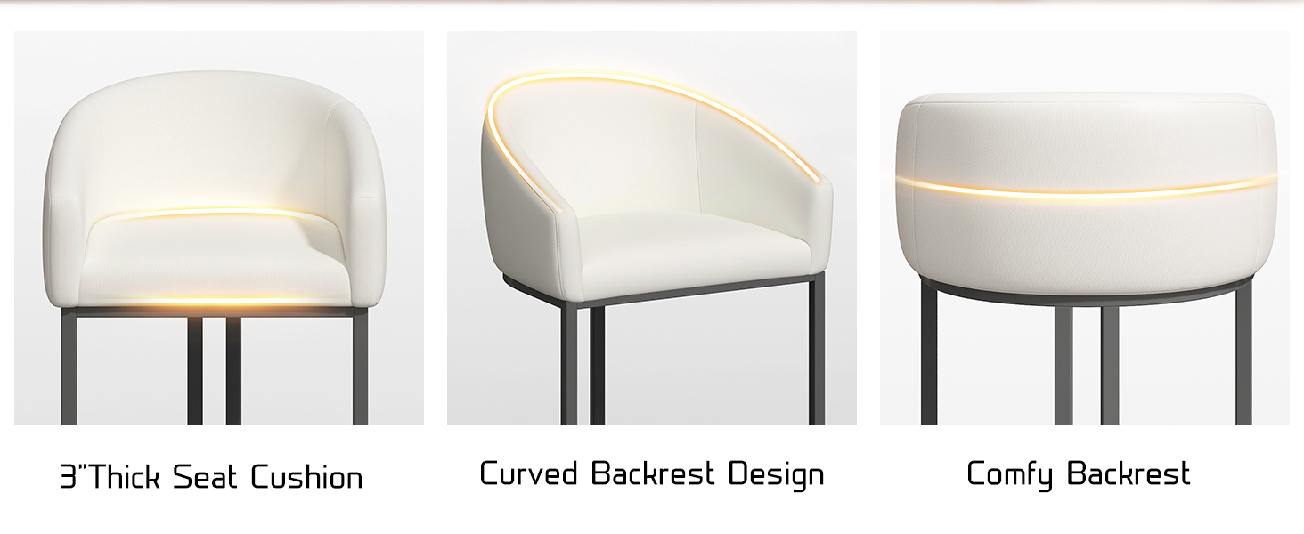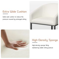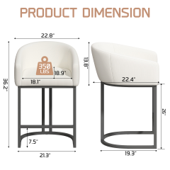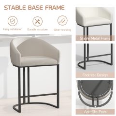 Sleek 26″ counter-height bar stools (set of 2) with modern barrel design in grey/white, linen-upholstered backs, sturdy 350-lb metal frame, non-slip pads, and easy assembly for versatile kitchen, bar, or lounge use.
